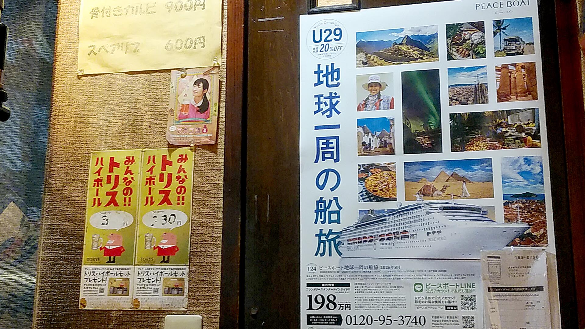学芸大学には約600軒の飲食店があるわけですが、今となっては果たして何軒で目にすることができるでしょう。ピースボートのポスター。