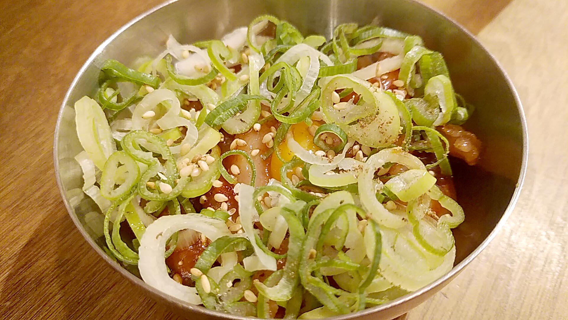 ネギタン(500円)は豚タンを薄くスライス。さっぱりとしたドレッシングのようなタレがかかっています。ボリュームもなかなか。