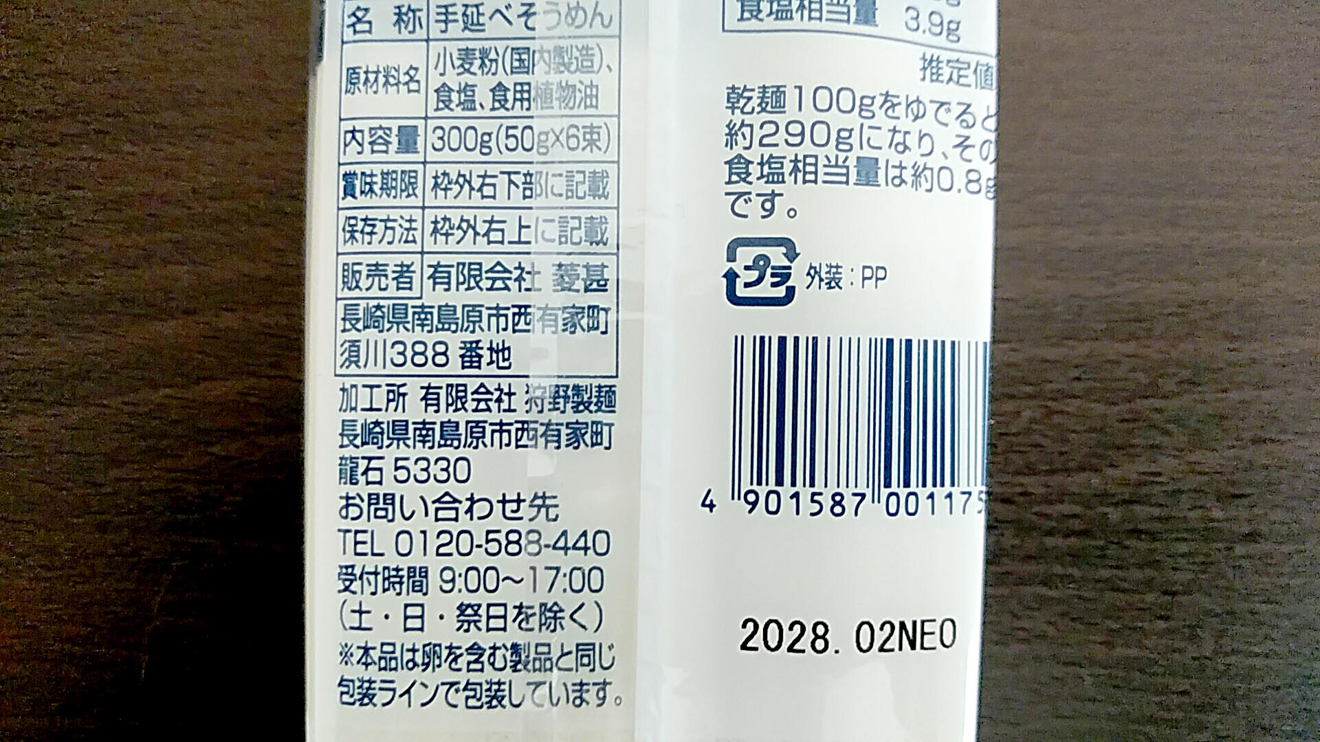 また、保存方法をここに書いているのは初めて見ました。普通、この場所にはそのそうめんの説明が書かれています。たとえば、「雲仙岳の清流がどうの」とか「職人が丹精を込めてどうの」とか「強いコシと滑らかなのど越しをどうの」とか。