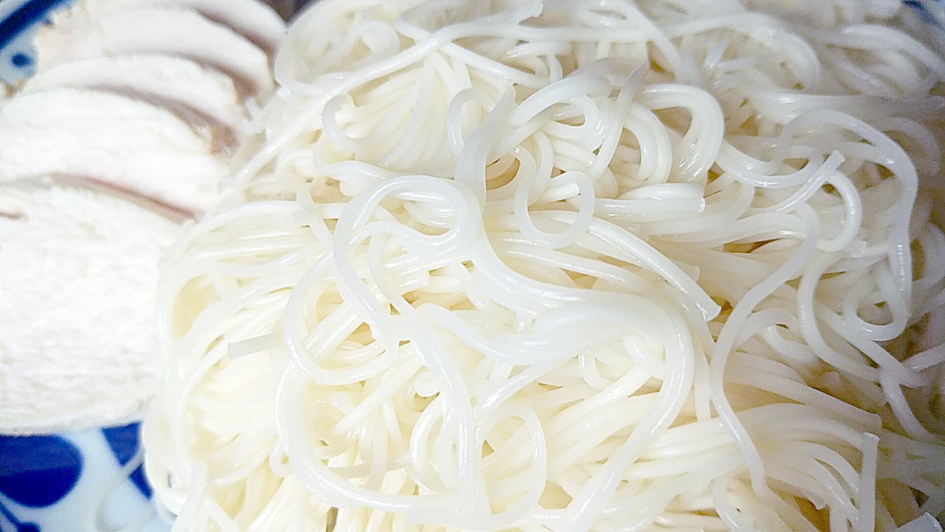茹で時間は1分30秒程度とありますが、この細さなら1分強で十分でしょう(私の好みからすると)。1分10秒ほどでお湯から上げ、冷水でさっとゆすぎ、氷水でしっかり締めました。