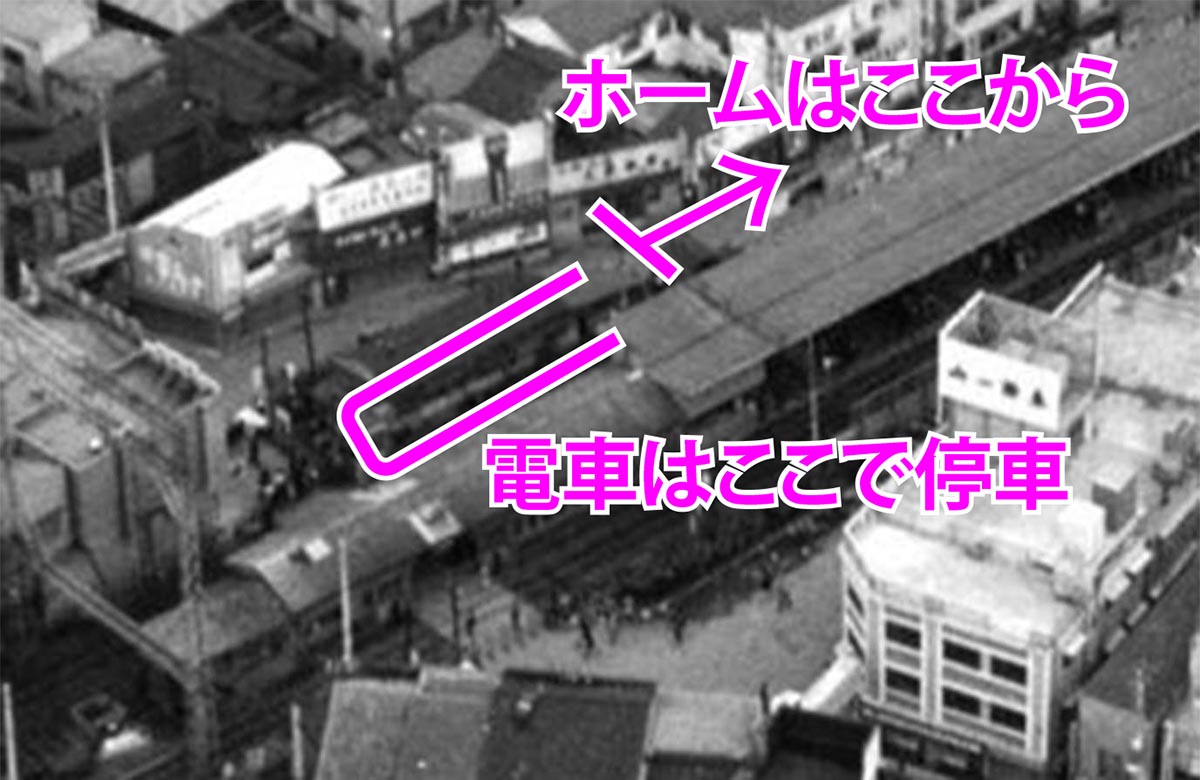 1950年といったら、第一師範駅が学芸大学駅に改称する直前。出札口や駅事務所を線路をまたいだ北側(渋谷寄り)に移し、もともとの本屋と屋根でつなげたのは青山師範駅時代(もしくは碑文谷駅時代)です(詳細後述)。