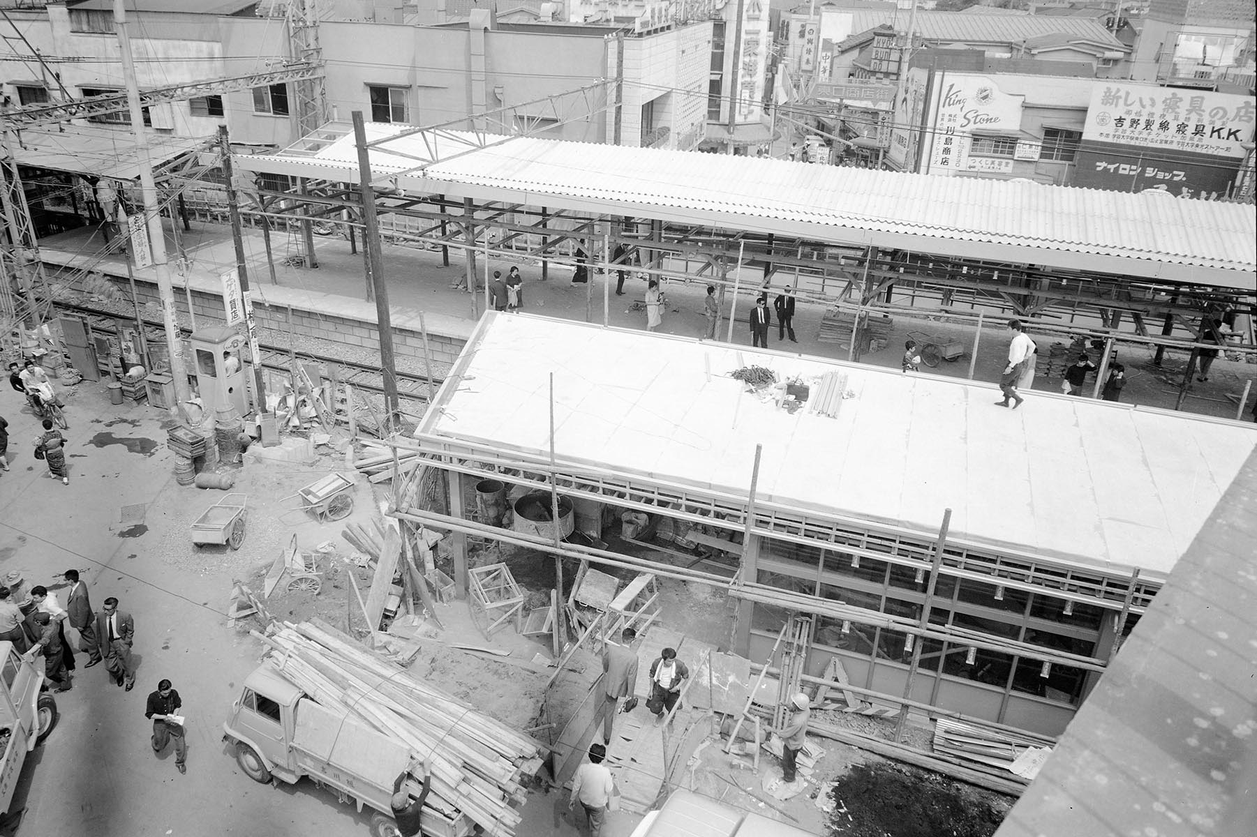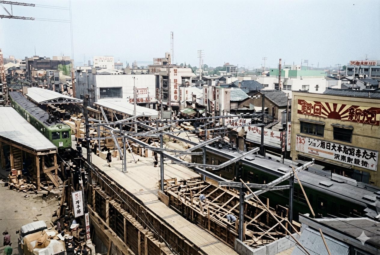 参考までにこちらをご覧ください。撮影年は不明ですが、1961年に高架化された都立大学駅の工事の様子です。学芸大学駅周辺の工事に比べ、なんてゆったりとしていることでしょうw