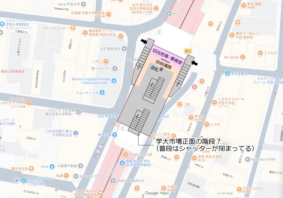 そしてこちらが記事執筆時の学芸大学駅および駅構内です。