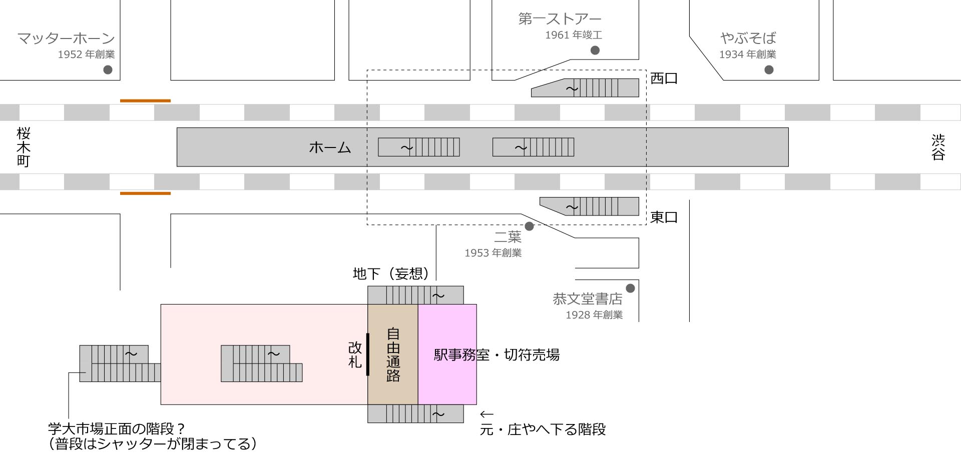 完成した地下がどうなっていたのか、写真はもちろん資料も一切ありません(東急電鉄にはあるだろうけど)。一応、妄想で地下改札をイラストにしてみました。