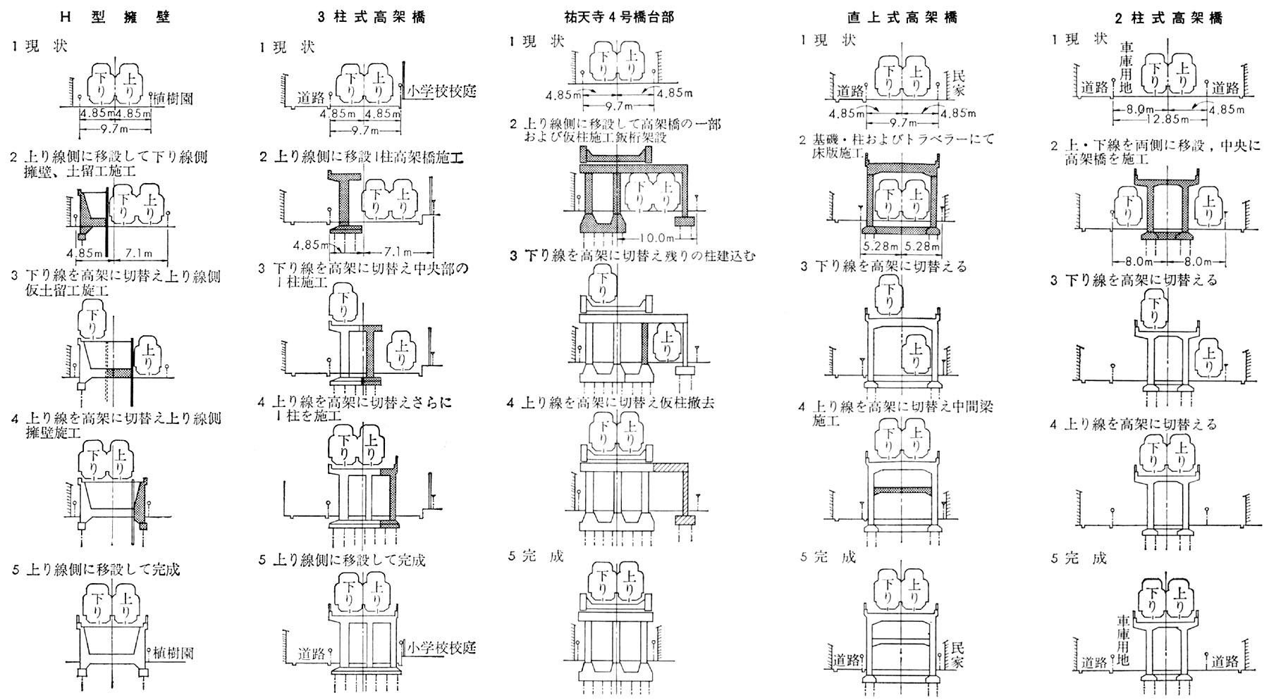 詳しいことは置いておいて注目したいのが、H型擁壁、3柱式高架橋など、一般的な高架工事の名称が並ぶ中、祐天寺4号橋第部だけ個別の名称が与えられた方式で高架化されたということです。