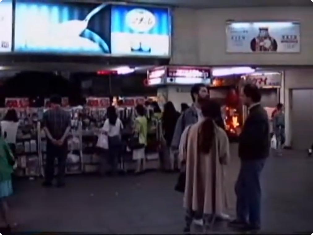 駅の造り自体は基本的に現在と同じです。東急ショッピングコリドールの派手で大きな看板が目立ちますね。地下への階段があった場所には小屋のような建物が建てられました。ソフトクリームの看板が出てるので、軽食・喫茶って感じのお店だったのでしょうか。