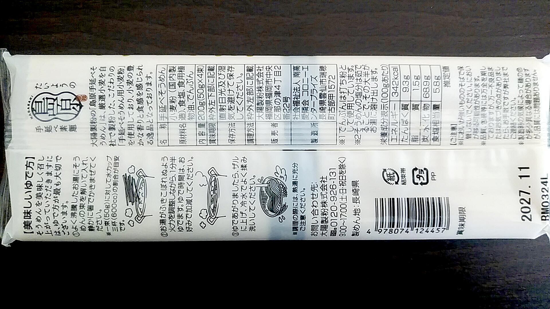 そうめんのセレクトが界隈ではダントツにいいオーケー 池尻大橋店で見つけました。193円/200g。一般的なそうめんの量・300gに換算すると289円。手延べそうめんとしては高くもなく安くもなく、と言いたいところなんですが、昨今の物価高を鑑みると、比較的安いかもしれません。