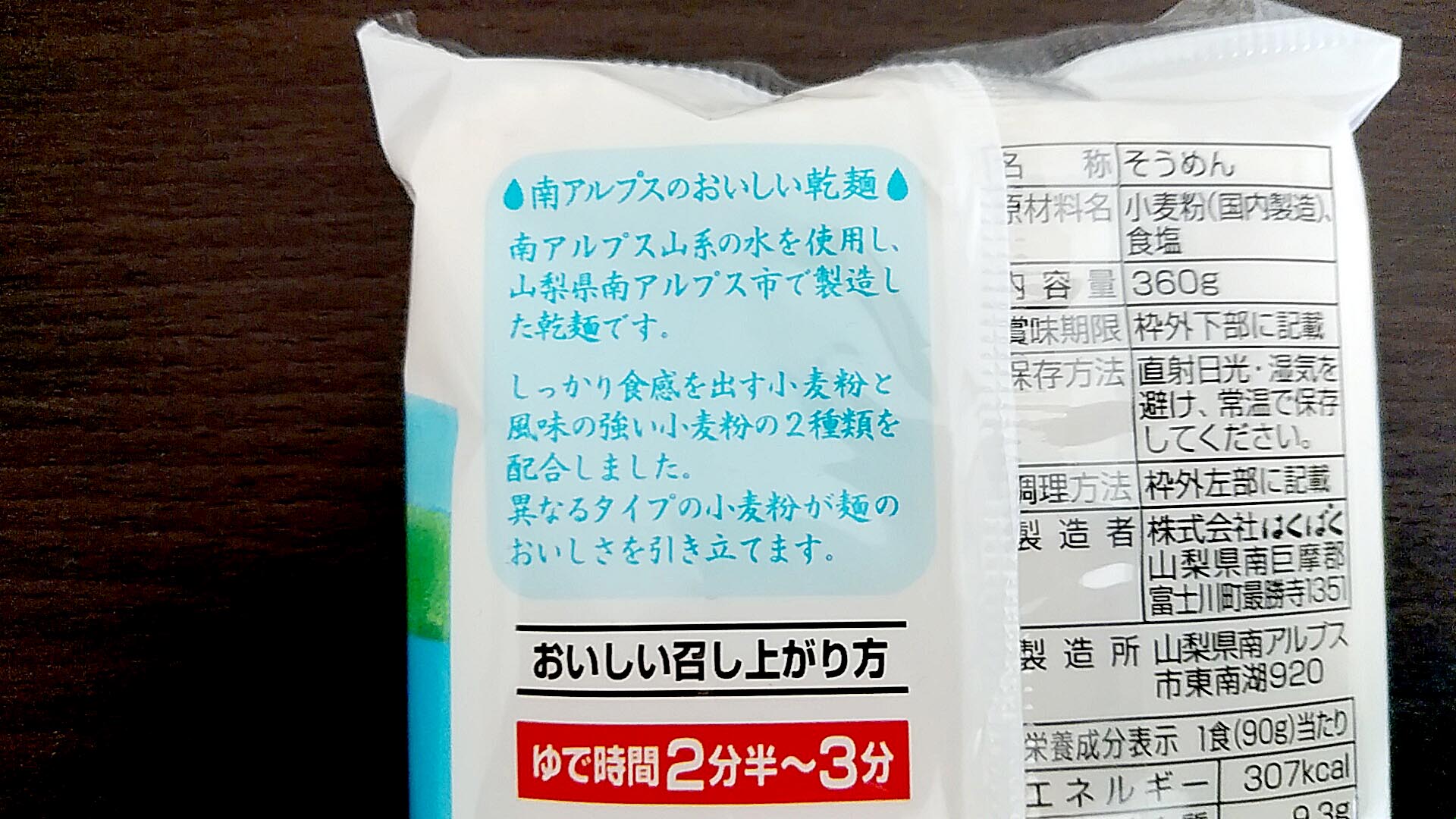 文化堂 緑ケ丘店で購入しました。181円/360g。一般的なそうめんの量・300gに換算すると150円。機械麺そうめんとしては普通の値段でしょうか。